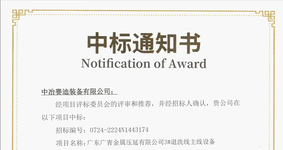 7月25日,中冶賽迪裝備接到廣青金屬壓延有限公司中標(biāo)通知書,由賽迪股份、賽迪裝備共同開拓的廣東廣青金屬壓延3#不銹鋼退火酸洗主線設(shè)備成套項目成功中標(biāo)。
